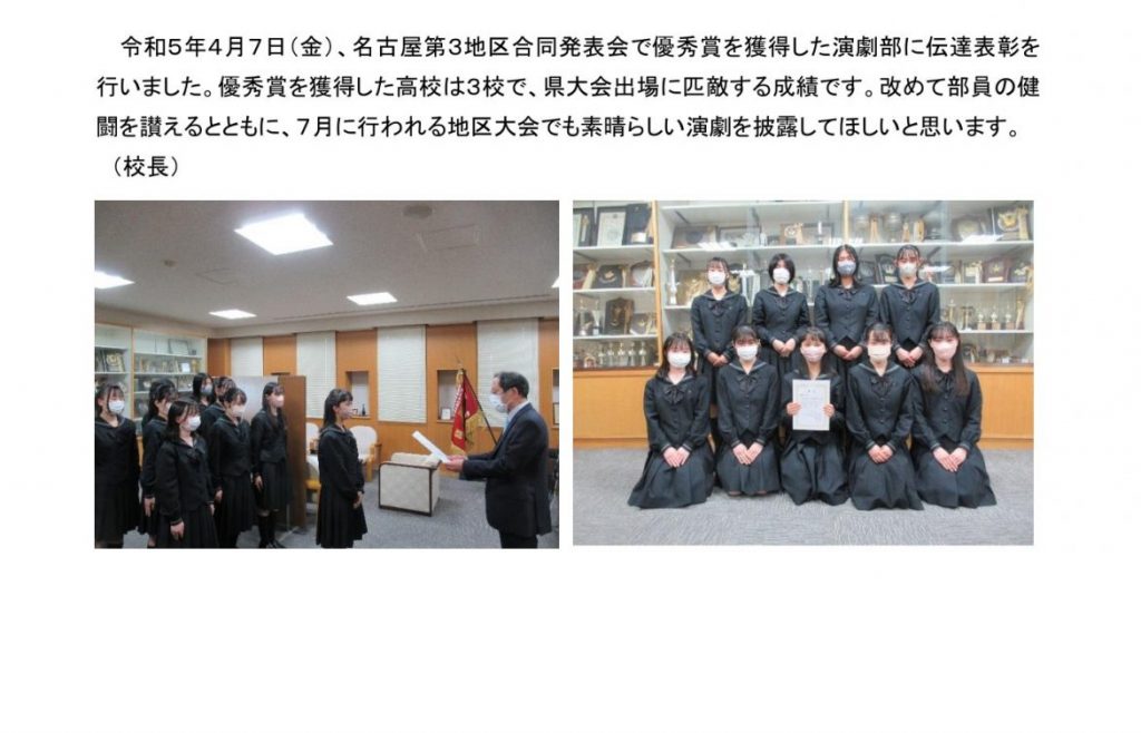 演劇部に優秀賞の伝達表彰を行いました